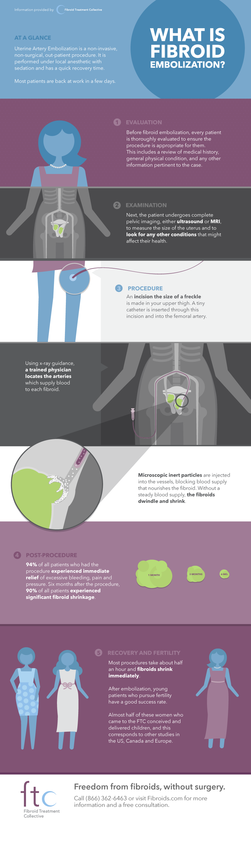 Uterine artery embolization is a non-invasive, non-surgical, out-patient procedure. It is performed under local anesthetic with sedation and has a quick recovery time. We’ve created the following infographic to help explain what fibroid embolization is and how it is done.